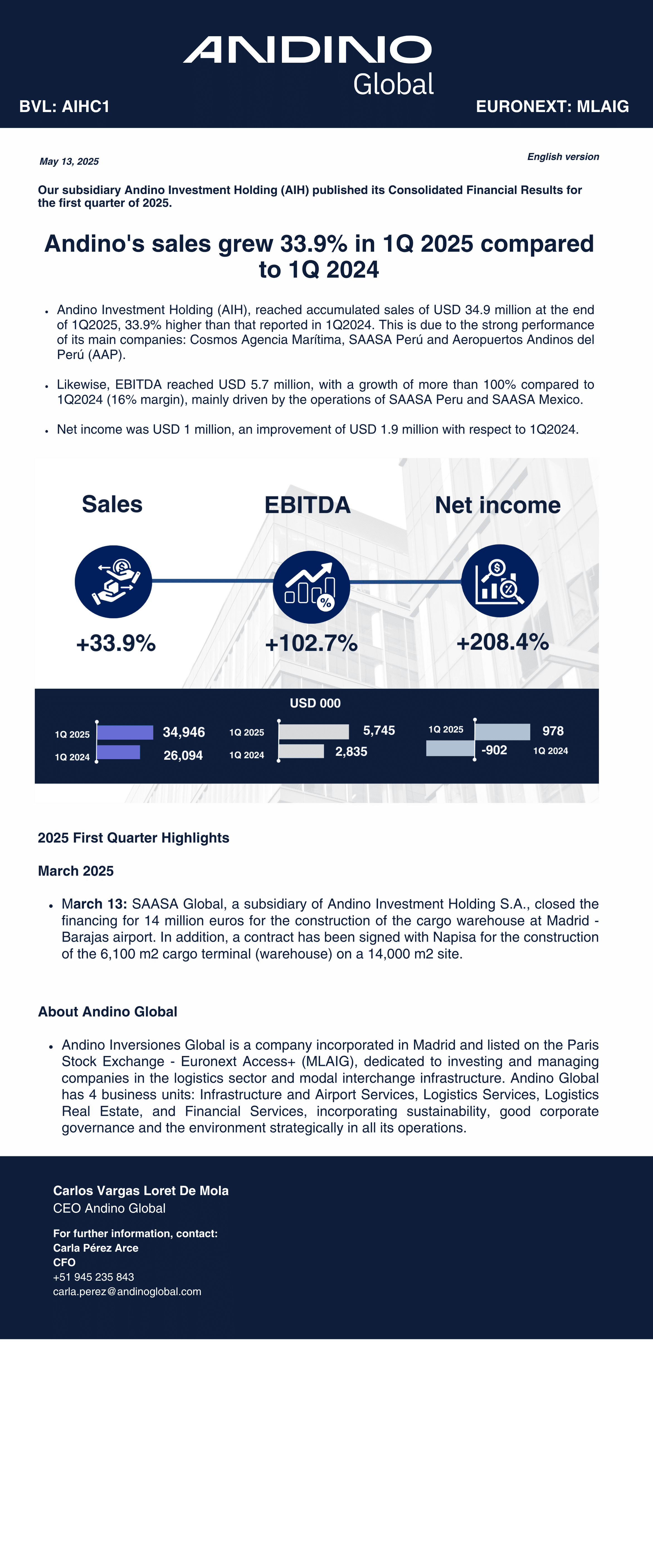 Andino´s sales grew 33.9% in 1Q 2025 compared to 1Q 2024