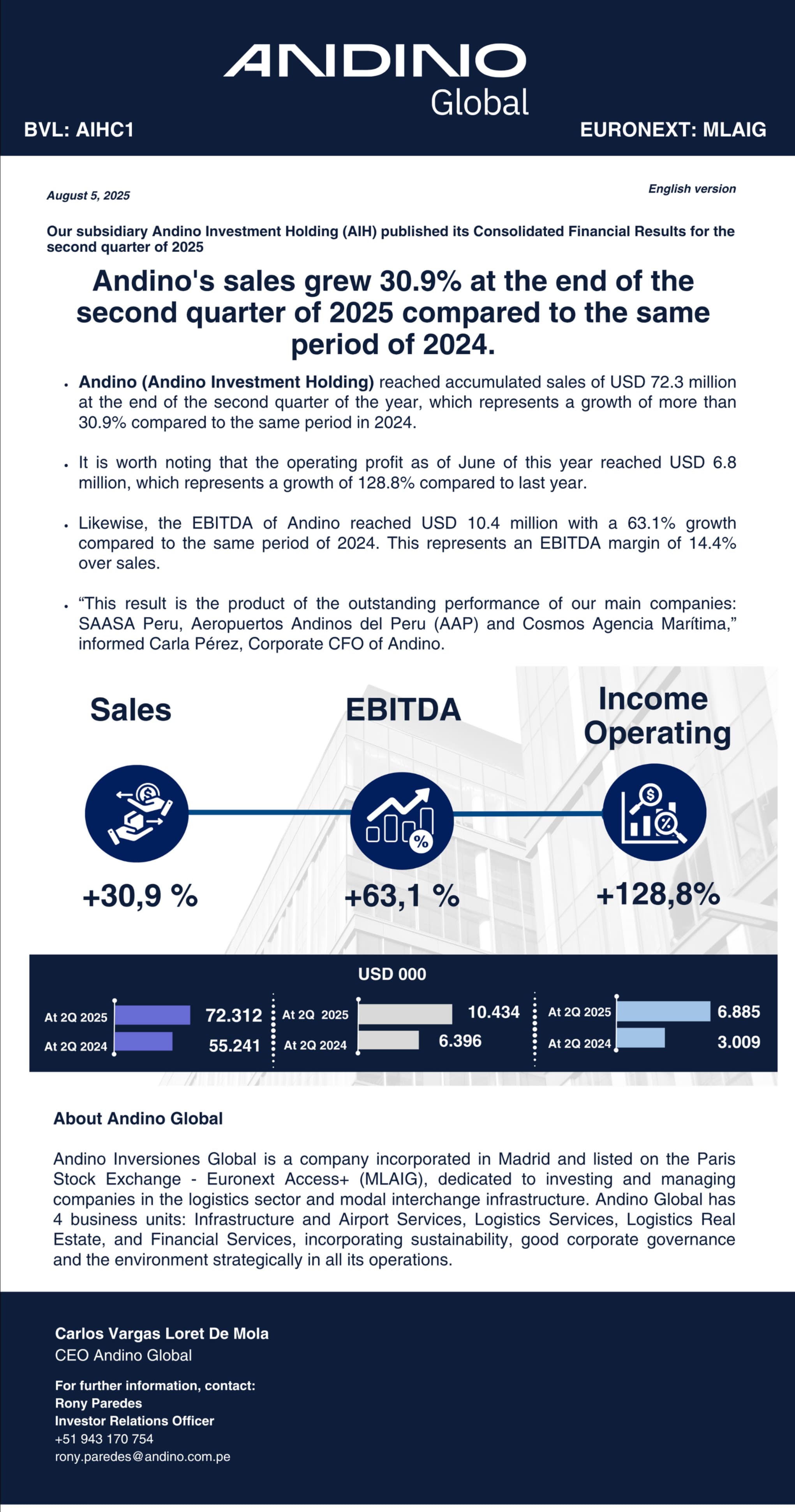 Andino´s sales grew 30.9% at the end of the second quarter of 2025 compared to the same period of 2024