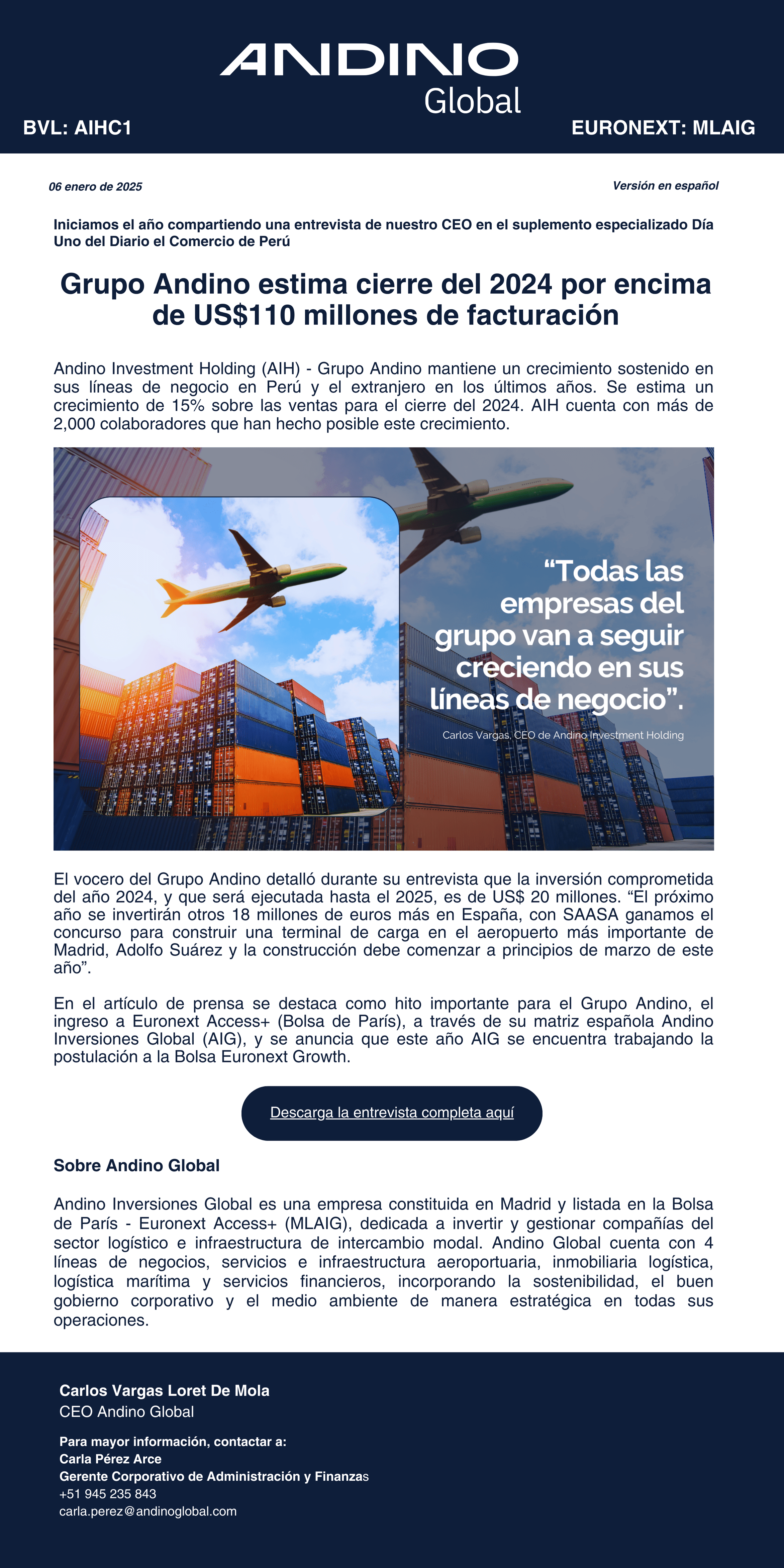 3 de Enero del 2025 Grupo Andino estima cierre del 2024 por encima de US$110 millones de facturación Descargar newsletter Referente