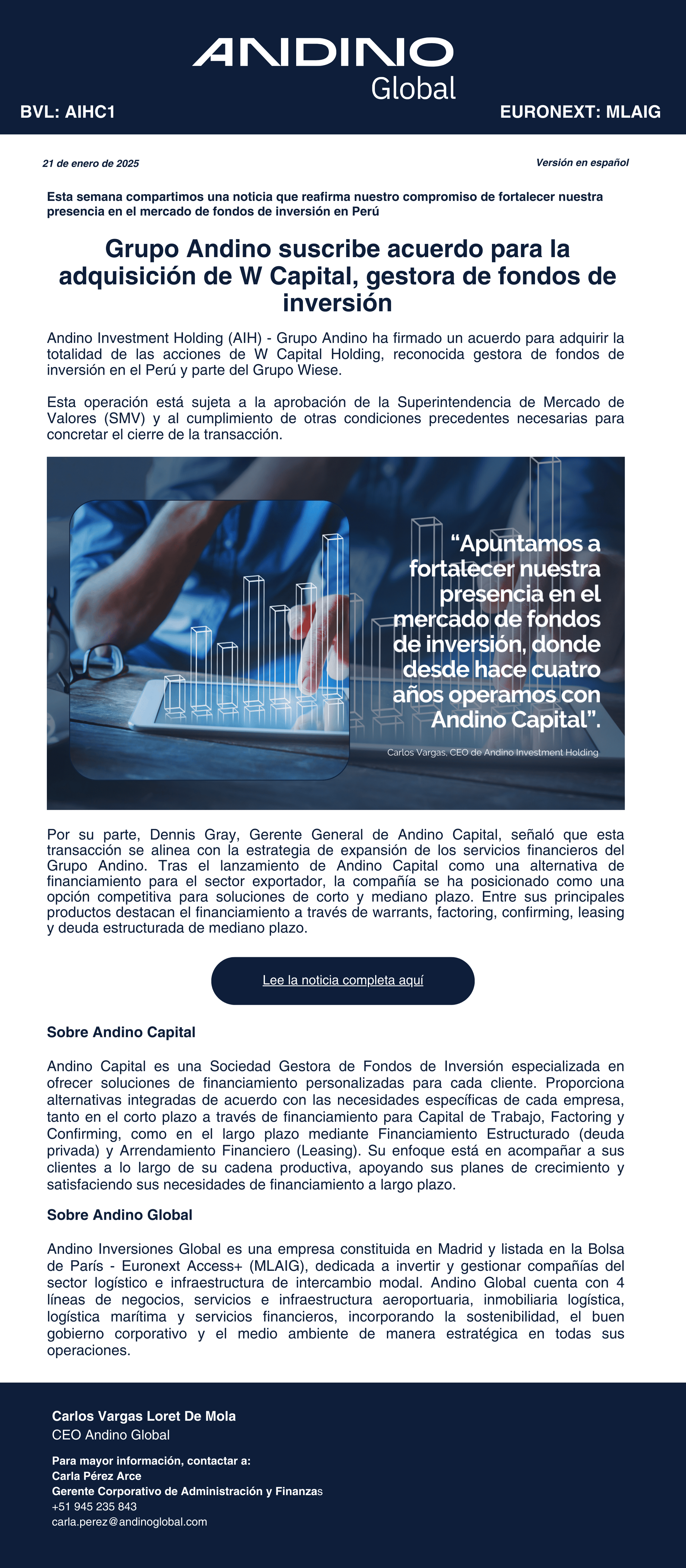 21 de Enero del 2025 Grupo Andino suscribe acuerdo para la adquisición de W Capital Descargar newsletter Referente